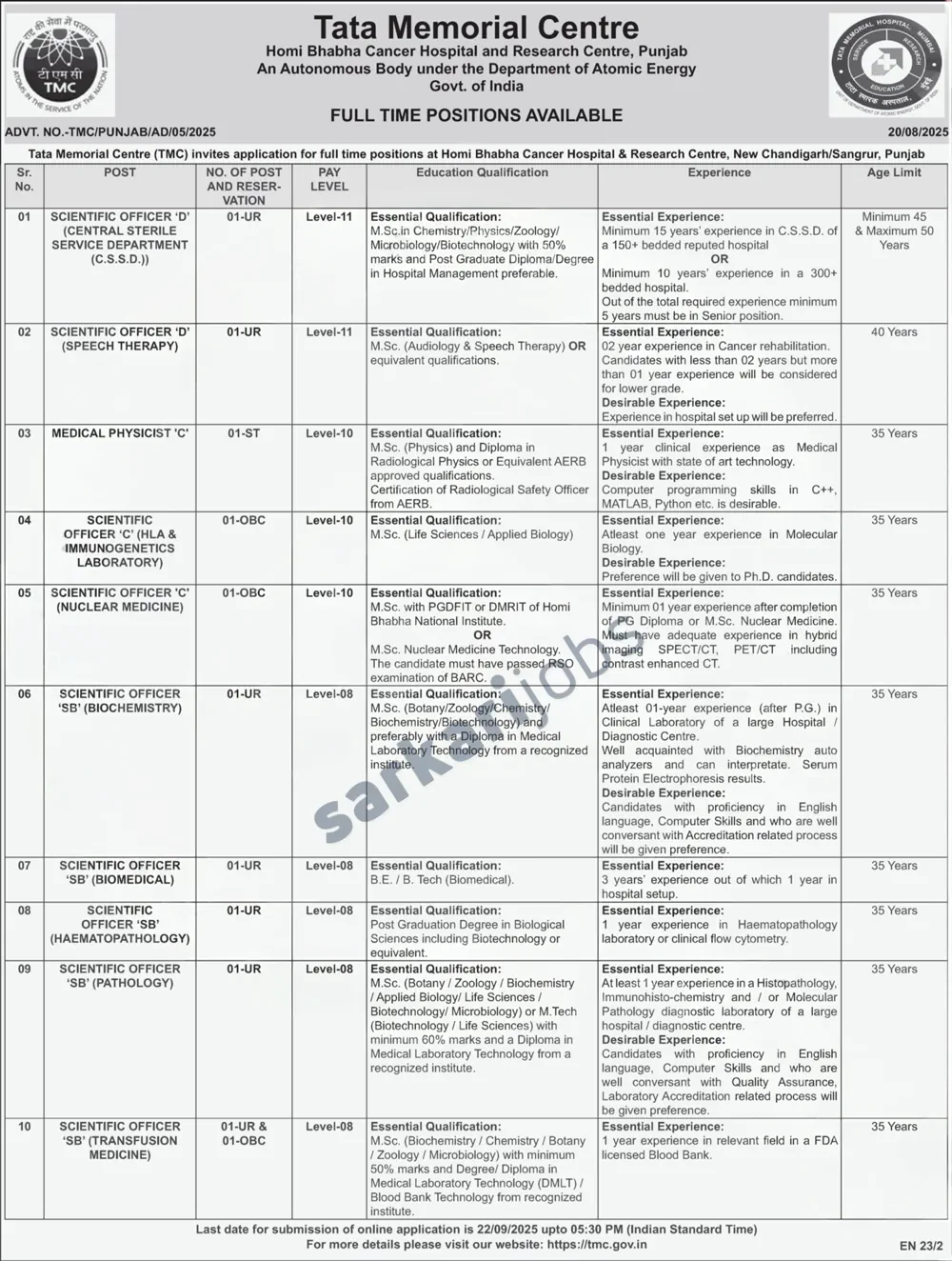 Tata Memorial Centre (TMC) is inviting applications for the post of Medical Physicist ‘C’ under Advertisement No. TMC/PUNJAB/AD/05/2025. The vacancy is for the Homi Bhabha Cancer Hospital & Research Centre located in New Chandigarh/Sangrur, Punjab. Candidates holding an M.Sc. in Physics with a Diploma in Radiological Physics or equivalent AERB-approved qualification can apply for this post. This is an excellent opportunity for ST category candidates with a specialization in Medical Physics. The last date to apply online is 22nd September 2025 (05:30 PM IST).